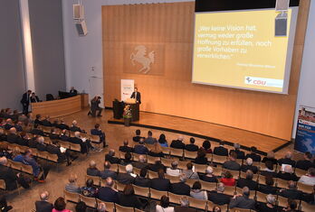 Der Sitzungssaal war gerichtet, der Zeitplan fixiert und die Gäste eingeladen: Auch in diesem Jahr durfte die CDU-Gemeinderatsfraktion über 500 Gäste zu ihrem traditionellen Neujahrsempfang begrüßen. Egal ob aus der Kommunal-, Landes- oder Bundespolitik, der Zivilgesellschaft, der Wirtschaft, der Kultur, der Wissenschaft oder dem Sport: Ein Querschnitt der Stadtgesellschaft durfte an diesem Abend unter dem Motto der „Vision Stuttgart 2030“ erleben, welche Dynamik und welche Kraft eine Vision im individuellen Leben eines jeden Einzelnen, aber auch im Zusammenleben des Kollektivs auslösen kann. Hierfür veranschaulichte der Festredner, Dr. Jens-Uwe Meyer, an mehreren Beispielen wie wichtig es ist immer an eine Vision zu glauben, auch wenn der Weg zur Erfüllung einer solchen schwierig und steinig erscheint.